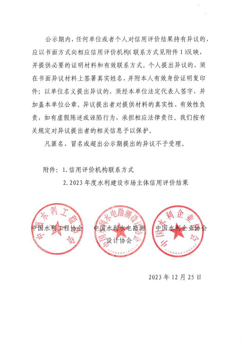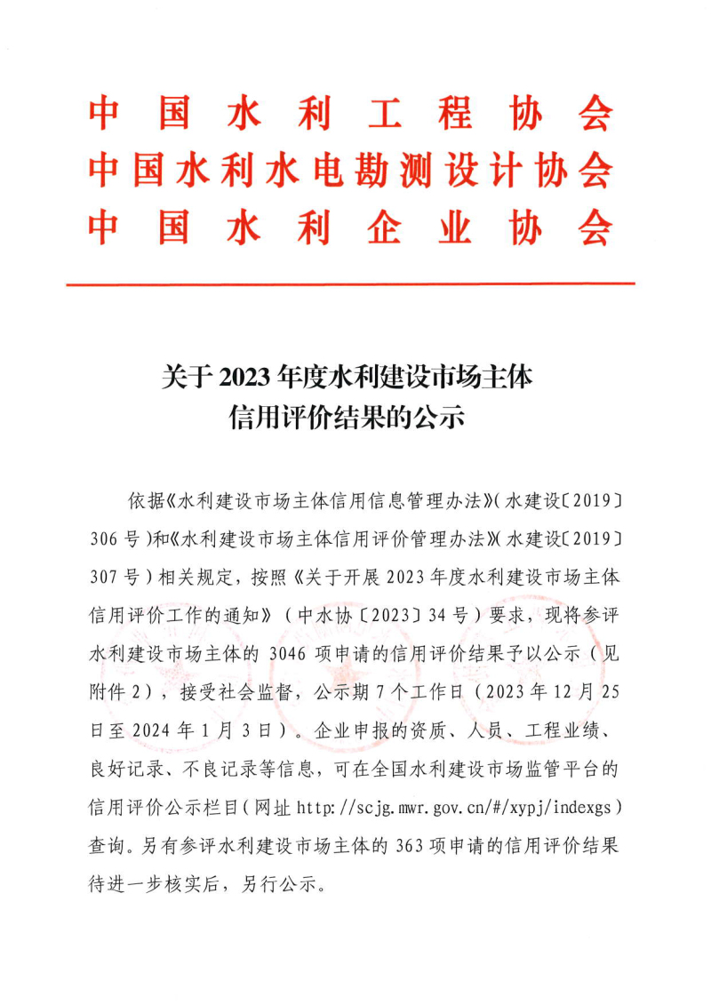 关于2023年度水利建设市场主体信用评价结果的公示